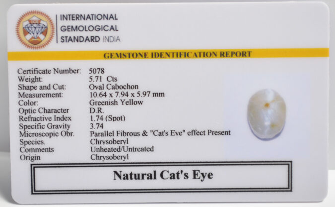 Beautiful 5.71 Cts Natural Cat’s Eye (AAA+-Mines) sva 6+ Ratti CATS EYE. Free Horoscope & Free Pundit Ji Astrological Advise / Consultation. Original Natural Lab certified gems by IGI GTL / Birth stones / Large Gem Selection of shree shubh Rashi Ratan Vedic dhan at Gem Mines. May Bhagwan Brahma, Vishnu, Shiv & Universe bless you.
