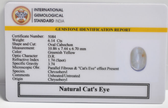 Beautiful 6.14 Cts Natural Cat’s Eye (AAA+-Mines) sva 6+ Ratti CATS EYE. Free Horoscope & Free Pundit Ji Astrological Advise / Consultation. Original Natural Lab certified gems by IGI GTL / Birth stones / Large Gem Selection of shree shubh Rashi Ratan Vedic dhan at Gem Mines. May Bhagwan Brahma, Vishnu, Shiv & Universe bless you.