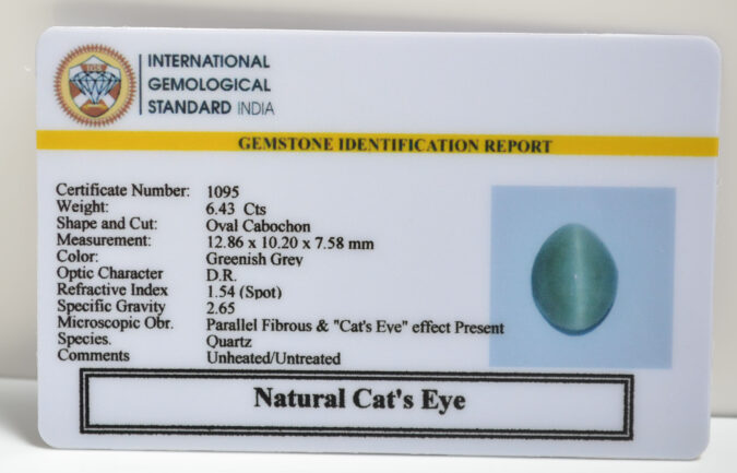 Beautiful 6.43 Cts Natural Cat’s Eye (AAA-Mines) sva 7 Ratti CATS EYE. Free Horoscope & Free Pundit Ji Astrological Advise / Consultation. Original Natural Lab certified gems by IGI GTL / Birth stones / Large Gem Selection of shree shubh Rashi Ratan Vedic dhan at Gem Mines. May Bhagwan Brahma, Vishnu, Shiv & Universe bless you.