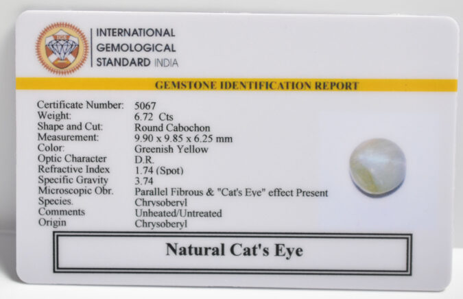 Beautiful 6.72 Cts Natural Cat’s Eye (AAA+-Mines) sva 7+ Ratti CATS EYE. Free Horoscope & Free Pundit Ji Astrological Advise / Consultation. Original Natural Lab certified gems by IGI GTL / Birth stones / Large Gem Selection of shree shubh Rashi Ratan Vedic dhan at Gem Mines. May Bhagwan Brahma, Vishnu, Shiv & Universe bless you.