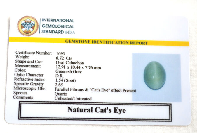 Beautiful 6.72 Cts Natural Cat’s Eye (AAA-Mines) sva 7 Ratti CATS EYE. Free Horoscope & Free Pundit Ji Astrological Advise / Consultation. Original Natural Lab certified gems by IGI GTL / Birth stones / Large Gem Selection of shree shubh Rashi Ratan Vedic dhan at Gem Mines. May Bhagwan Brahma, Vishnu, Shiv & Universe bless you.