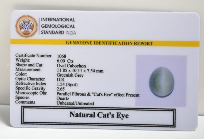 Beautiful 6 Cts Natural Cat’s Eye (AAA-Mines) sva 6 Ratti CATS EYE. Free Horoscope & Free Pundit Ji Astrological Advise / Consultation. Original Natural Lab certified gems by IGI GTL / Birth stones / Large Gem Selection of shree shubh Rashi Ratan Vedic dhan at Gem Mines. May Bhagwan Brahma, Vishnu, Shiv & Universe bless you.