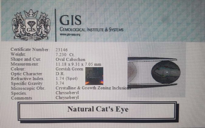 Beautiful 7.23 Ct. Cat’s Eye (Chrysoberyl Mines) Sava 8 Ratti Lehsunia. Free Horoscope & Free Pundit Ji Advise / Consultation. Original Natural Lab certified gems by IGI GTL / Birth stones / Large Gem Selection of shree shubh Rashi Ratan Vedic dhan at Gem Mines. May Bhagwan Brahma, Vishnu, Shiv & Universe bless you.