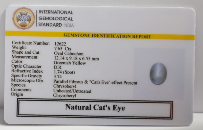 Beautiful 7.63 Cts Natural Cat’s Eye (Top-Mines) sva 8+ Ratti CATS EYE. Free Horoscope & Free Pundit Ji Astrological Advise / Consultation. Original Natural Lab certified gems by IGI GTL / Birth stones / Large Gem Selection of shree shubh Rashi Ratan Vedic dhan at Gem Mines. May Bhagwan Brahma, Vishnu, Shiv & Universe bless you.