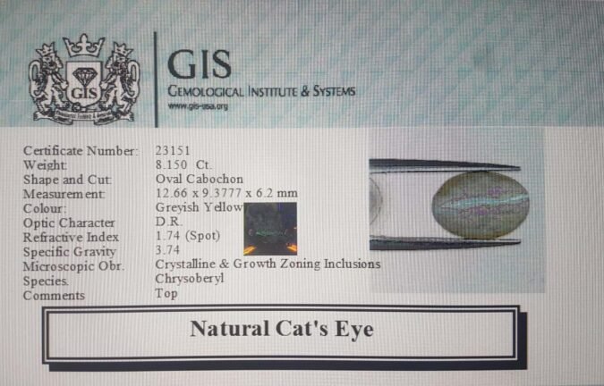 Beautiful 8.15 Ct. Cat’s Eye (Kanak Khet (Chrysoberyl) Mines) Sava 9 Ratti Lehsunia. Free Horoscope & Free Pundit Ji Advise / Consultation. Original Natural Lab certified gems by IGI GTL / Birth stones / Large Gem Selection of shree shubh Rashi Ratan Vedic dhan at Gem Mines. May Bhagwan Brahma, Vishnu, Shiv & Universe bless you.