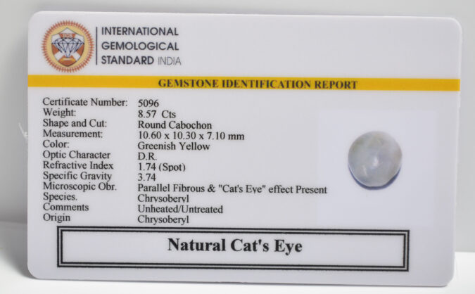Beautiful 8.57 Cts Natural Cat’s Eye (AAA+-Mines) sva 9+ Ratti CATS EYE. Free Horoscope & Free Pundit Ji Astrological Advise / Consultation. Original Natural Lab certified gems by IGI GTL / Birth stones / Large Gem Selection of shree shubh Rashi Ratan Vedic dhan at Gem Mines. May Bhagwan Brahma, Vishnu, Shiv & Universe bless you.