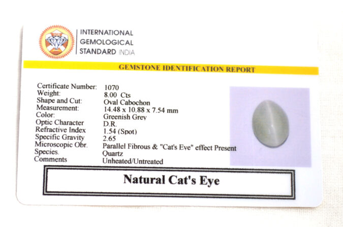 Beautiful 8 Cts Natural Cat’s Eye (AAA-Mines) sva 8 Ratti CATS EYE. Free Horoscope & Free Pundit Ji Astrological Advise / Consultation. Original Natural Lab certified gems by IGI GTL / Birth stones / Large Gem Selection of shree shubh Rashi Ratan Vedic dhan at Gem Mines. May Bhagwan Brahma, Vishnu, Shiv & Universe bless you.