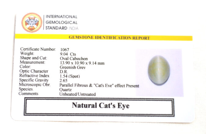 Beautiful 9.04 Cts Natural Cat’s Eye (AAA-Mines) sva 10 Ratti CATS EYE. Free Horoscope & Free Pundit Ji Astrological Advise / Consultation. Original Natural Lab certified gems by IGI GTL / Birth stones / Large Gem Selection of shree shubh Rashi Ratan Vedic dhan at Gem Mines. May Bhagwan Brahma, Vishnu, Shiv & Universe bless you.