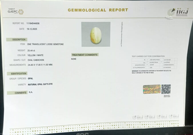 Beautiful 25.44 Cts Natural Cat’s Eye Opal (Top-Mines) sva 28+ Ratti Cats Eye Opal. Free Horoscope & Free Pundit Ji Astrological Advise / Consultation. Original Natural Lab certified gems by IGI GTL / Birth stones / Large Gem Selection of shree shubh Rashi Ratan Vedic dhan at Gem Mines. May Bhagwan Brahma, Vishnu, Shiv & Universe bless you.