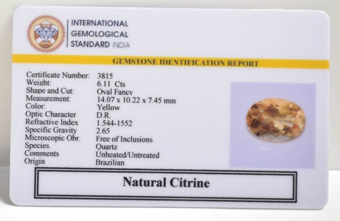 Beautiful 6.11 Cts Natural Citrine (AAA+-Mines) sva 6+ Ratti CITRINE. Free Horoscope & Free Pundit Ji Astrological Advise / Consultation. Original Natural Lab certified gems by IGI GTL / Birth stones / Large Gem Selection of shree shubh Rashi Ratan Vedic dhan at Gem Mines. May Bhagwan Brahma, Vishnu, Shiv & Universe bless you.