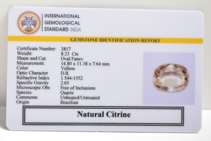 Beautiful 8.23 Cts Natural Citrine (AAA+-Mines) sva 9+ Ratti CITRINE. Free Horoscope & Free Pundit Ji Astrological Advise / Consultation. Original Natural Lab certified gems by IGI GTL / Birth stones / Large Gem Selection of shree shubh Rashi Ratan Vedic dhan at Gem Mines. May Bhagwan Brahma, Vishnu, Shiv & Universe bless you.