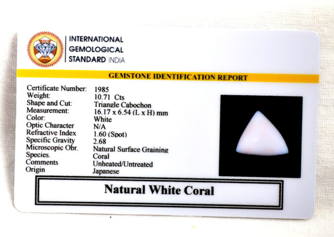 Beautiful 10.71 Cts Natural White Coral (AAA-Mines) sva 11+ Ratti CORAL. Free Horoscope & Free Pundit Ji Astrological Advise / Consultation. Original Natural Lab certified gems by IGI GTL / Birth stones / Large Gem Selection of shree shubh Rashi Ratan Vedic dhan at Gem Mines. May Bhagwan Brahma, Vishnu, Shiv & Universe bless you.