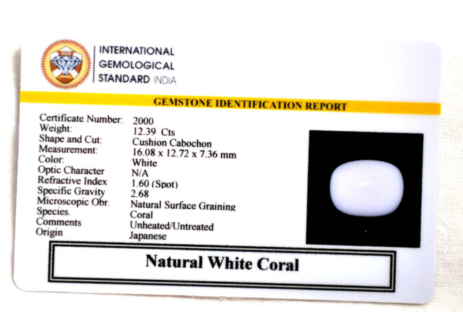 Beautiful 12.39 Cts Natural White Coral (AAA+-Mines) sva 13+ Ratti CORAL. Free Horoscope & Free Pundit Ji Astrological Advise / Consultation. Original Natural Lab certified gems by IGI GTL / Birth stones / Large Gem Selection of shree shubh Rashi Ratan Vedic dhan at Gem Mines. May Bhagwan Brahma, Vishnu, Shiv & Universe bless you.