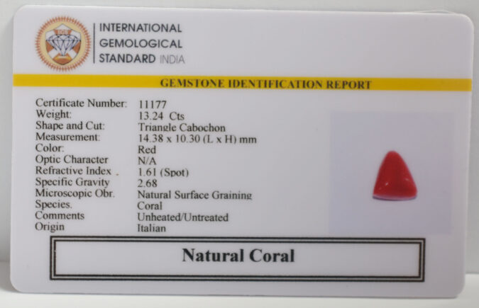 Beautiful 13.24 Cts Natural Coral (AAA+-Mines) sva 14+ Ratti CORAL. Free Horoscope & Free Pundit Ji Astrological Advise / Consultation. Original Natural Lab certified gems by IGI GTL / Birth stones / Large Gem Selection of shree shubh Rashi Ratan Vedic dhan at Gem Mines. May Bhagwan Brahma, Vishnu, Shiv & Universe bless you.