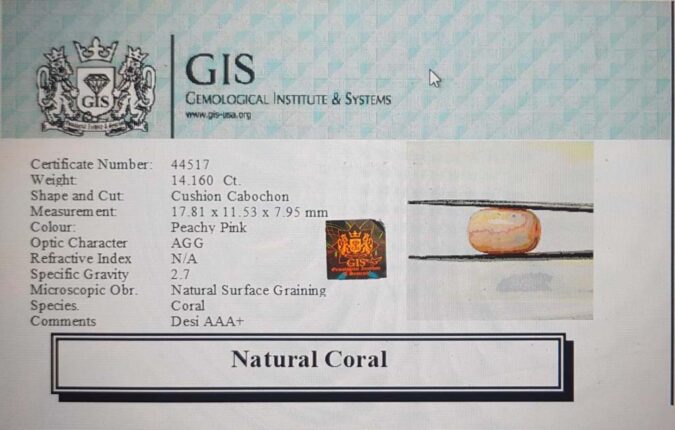 Beautiful 14.16 Ct. Coral (Desi Coral Mines) Sava 15 Ratti Moonga. Free Horoscope & Free Pundit Ji Advise / Consultation. Original Natural Lab certified gems by IGI GTL / Birth stones / Large Gem Selection of shree shubh Rashi Ratan Vedic dhan at Gem Mines. May Bhagwan Brahma, Vishnu, Shiv & Universe bless you.