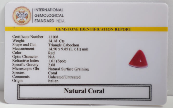Beautiful 14.18 Cts Natural Coral (Top-Mines) sva 15+ Ratti CORAL. Free Horoscope & Free Pundit Ji Astrological Advise / Consultation. Original Natural Lab certified gems by IGI GTL / Birth stones / Large Gem Selection of shree shubh Rashi Ratan Vedic dhan at Gem Mines. May Bhagwan Brahma, Vishnu, Shiv & Universe bless you.