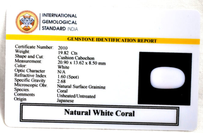 Beautiful 19.82 Cts Natural White Coral (AAA-Mines) sva 22+ Ratti CORAL. Free Horoscope & Free Pundit Ji Astrological Advise / Consultation. Original Natural Lab certified gems by IGI GTL / Birth stones / Large Gem Selection of shree shubh Rashi Ratan Vedic dhan at Gem Mines. May Bhagwan Brahma, Vishnu, Shiv & Universe bless you.