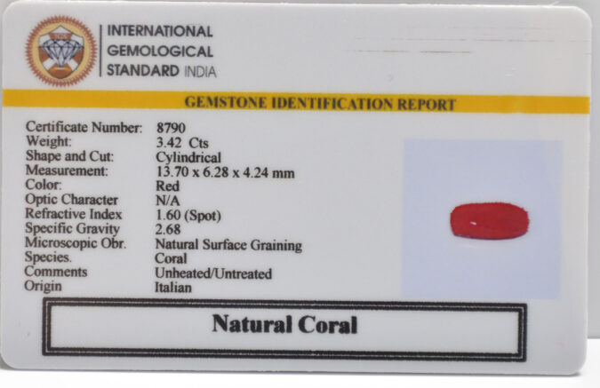 Beautiful 3.42 Cts Natural Coral (Very Good-Mines) sva 3+ Ratti CORAL. Free Horoscope & Free Pundit Ji Astrological Advise / Consultation. Original Natural Lab certified gems by IGI GTL / Birth stones / Large Gem Selection of shree shubh Rashi Ratan Vedic dhan at Gem Mines. May Bhagwan Brahma, Vishnu, Shiv & Universe bless you.