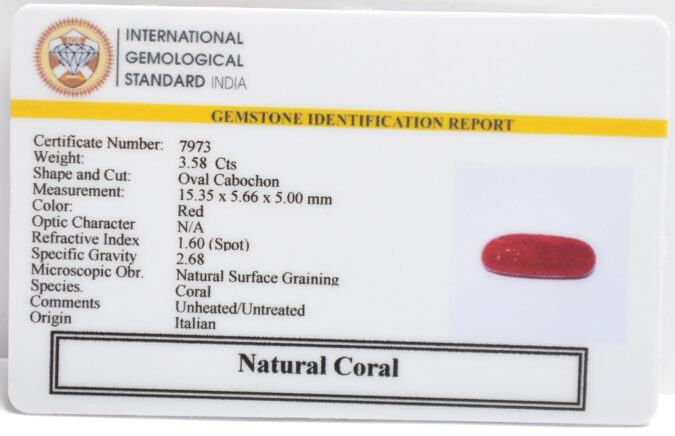 Beautiful 3.58 Cts Natural Coral (AAA-Mines) sva 3+ Ratti CORAL. Free Horoscope & Free Pundit Ji Astrological Advise / Consultation. Original Natural Lab certified gems by IGI GTL / Birth stones / Large Gem Selection of shree shubh Rashi Ratan Vedic dhan at Gem Mines. May Bhagwan Brahma, Vishnu, Shiv & Universe bless you.