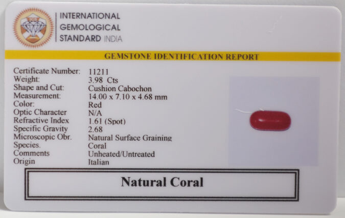 Beautiful 3.98 Cts Natural Coral (AAA-Mines) sva 4+ Ratti CORAL. Free Horoscope & Free Pundit Ji Astrological Advise / Consultation. Original Natural Lab certified gems by IGI GTL / Birth stones / Large Gem Selection of shree shubh Rashi Ratan Vedic dhan at Gem Mines. May Bhagwan Brahma, Vishnu, Shiv & Universe bless you.