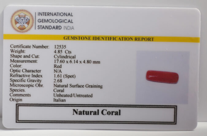 Certified Natural Coral 4.85 Ct.(5+ Ratti) in Cylindrical shape