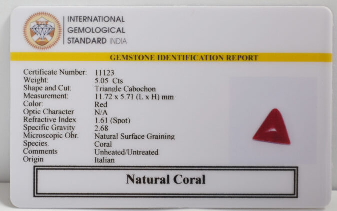 Beautiful 5.05 Cts Natural Coral (AAA+-Mines) sva 5+ Ratti CORAL. Free Horoscope & Free Pundit Ji Astrological Advise / Consultation. Original Natural Lab certified gems by IGI GTL / Birth stones / Large Gem Selection of shree shubh Rashi Ratan Vedic dhan at Gem Mines. May Bhagwan Brahma, Vishnu, Shiv & Universe bless you.