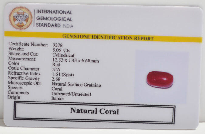 Beautiful 5.05 Cts Natural Coral (Top-Mines) sva 5+ Ratti CORAL. Free Horoscope & Free Pundit Ji Astrological Advise / Consultation. Original Natural Lab certified gems by IGI GTL / Birth stones / Large Gem Selection of shree shubh Rashi Ratan Vedic dhan at Gem Mines. May Bhagwan Brahma, Vishnu, Shiv & Universe bless you.