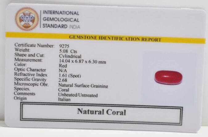 Beautiful 5.08 Cts Natural Coral (AAA+-Mines) sva 5+ Ratti CORAL. Free Horoscope & Free Pundit Ji Astrological Advise / Consultation. Original Natural Lab certified gems by IGI GTL / Birth stones / Large Gem Selection of shree shubh Rashi Ratan Vedic dhan at Gem Mines. May Bhagwan Brahma, Vishnu, Shiv & Universe bless you.