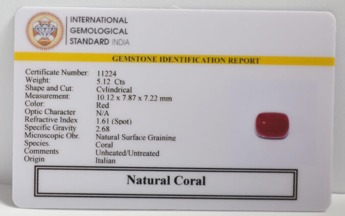 Beautiful 5.12 Cts Natural Coral (Top-Mines) sva 5+ Ratti CORAL. Free Horoscope & Free Pundit Ji Astrological Advise / Consultation. Original Natural Lab certified gems by IGI GTL / Birth stones / Large Gem Selection of shree shubh Rashi Ratan Vedic dhan at Gem Mines. May Bhagwan Brahma, Vishnu, Shiv & Universe bless you.