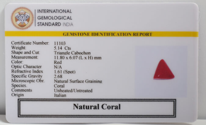 Beautiful 5.14 Cts Natural Coral (AAA+-Mines) sva 5+ Ratti CORAL. Free Horoscope & Free Pundit Ji Astrological Advise / Consultation. Original Natural Lab certified gems by IGI GTL / Birth stones / Large Gem Selection of shree shubh Rashi Ratan Vedic dhan at Gem Mines. May Bhagwan Brahma, Vishnu, Shiv & Universe bless you.