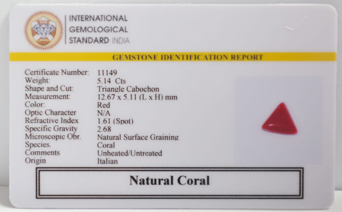 Beautiful 5.14 Cts Natural Coral (AAA+-Mines) sva 5+ Ratti CORAL. Free Horoscope & Free Pundit Ji Astrological Advise / Consultation. Original Natural Lab certified gems by IGI GTL / Birth stones / Large Gem Selection of shree shubh Rashi Ratan Vedic dhan at Gem Mines. May Bhagwan Brahma, Vishnu, Shiv & Universe bless you.