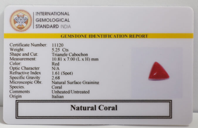Beautiful 5.25 Cts Natural Coral (Top-Mines) sva 5+ Ratti CORAL. Free Horoscope & Free Pundit Ji Astrological Advise / Consultation. Original Natural Lab certified gems by IGI GTL / Birth stones / Large Gem Selection of shree shubh Rashi Ratan Vedic dhan at Gem Mines. May Bhagwan Brahma, Vishnu, Shiv & Universe bless you.