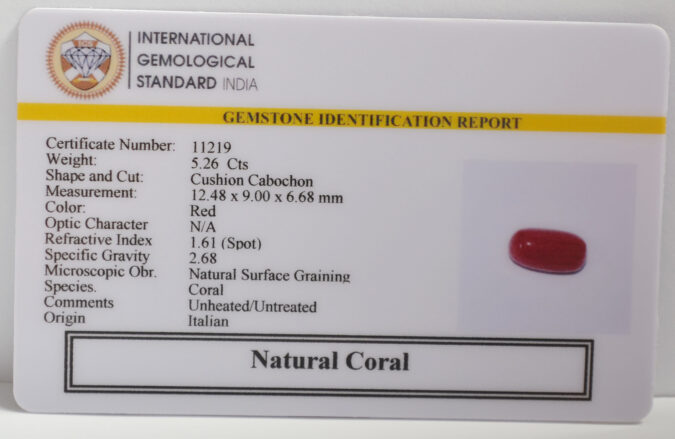 Beautiful 5.26 Cts Natural Coral (AAA+-Mines) sva 5+ Ratti CORAL. Free Horoscope & Free Pundit Ji Astrological Advise / Consultation. Original Natural Lab certified gems by IGI GTL / Birth stones / Large Gem Selection of shree shubh Rashi Ratan Vedic dhan at Gem Mines. May Bhagwan Brahma, Vishnu, Shiv & Universe bless you.