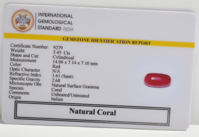 Beautiful 5.45 Cts Natural Coral (AAA+-Mines) sva 6+ Ratti CORAL. Free Horoscope & Free Pundit Ji Astrological Advise / Consultation. Original Natural Lab certified gems by IGI GTL / Birth stones / Large Gem Selection of shree shubh Rashi Ratan Vedic dhan at Gem Mines. May Bhagwan Brahma, Vishnu, Shiv & Universe bless you.