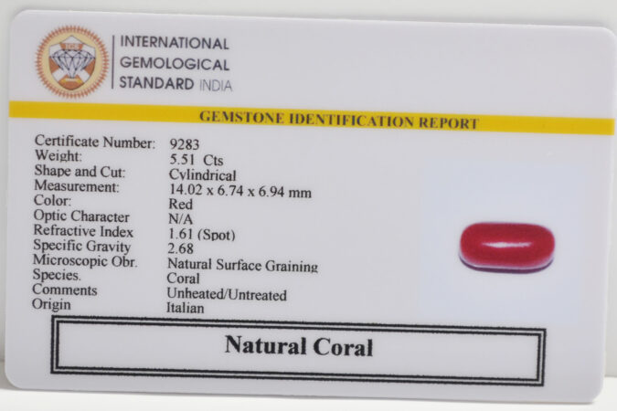 Beautiful 5.51 Cts Natural Coral (Top-Mines) sva 6+ Ratti CORAL. Free Horoscope & Free Pundit Ji Astrological Advise / Consultation. Original Natural Lab certified gems by IGI GTL / Birth stones / Large Gem Selection of shree shubh Rashi Ratan Vedic dhan at Gem Mines. May Bhagwan Brahma, Vishnu, Shiv & Universe bless you.