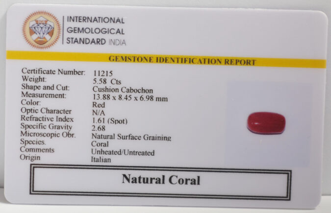 Beautiful 5.58 Cts Natural Coral (AAA+-Mines) sva 6+ Ratti CORAL. Free Horoscope & Free Pundit Ji Astrological Advise / Consultation. Original Natural Lab certified gems by IGI GTL / Birth stones / Large Gem Selection of shree shubh Rashi Ratan Vedic dhan at Gem Mines. May Bhagwan Brahma, Vishnu, Shiv & Universe bless you.