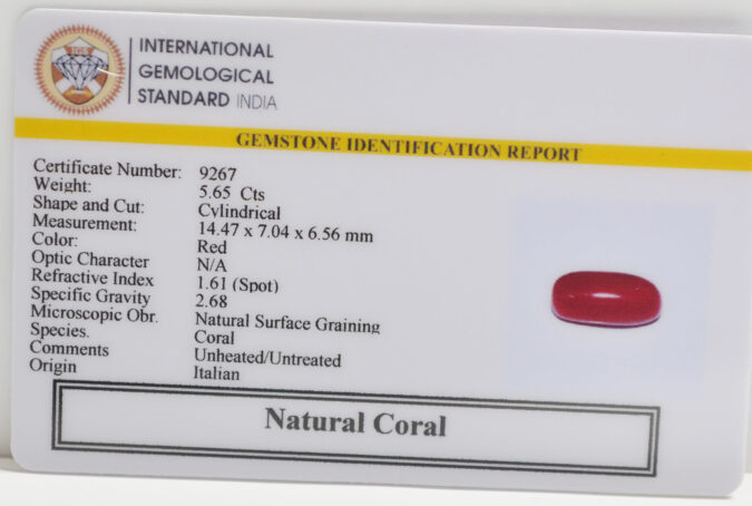 Beautiful 5.65 Cts Natural Coral (Top-Mines) sva 6+ Ratti CORAL. Free Horoscope & Free Pundit Ji Astrological Advise / Consultation. Original Natural Lab certified gems by IGI GTL / Birth stones / Large Gem Selection of shree shubh Rashi Ratan Vedic dhan at Gem Mines. May Bhagwan Brahma, Vishnu, Shiv & Universe bless you.