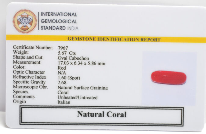 Beautiful 5.67 Cts Natural Coral (AAA-Mines) sva 6+ Ratti CORAL. Free Horoscope & Free Pundit Ji Astrological Advise / Consultation. Original Natural Lab certified gems by IGI GTL / Birth stones / Large Gem Selection of shree shubh Rashi Ratan Vedic dhan at Gem Mines. May Bhagwan Brahma, Vishnu, Shiv & Universe bless you.