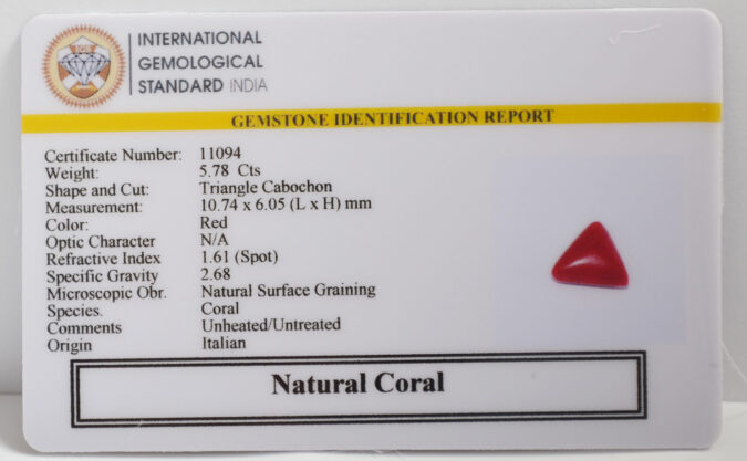 Beautiful 5.78 Cts Natural Coral (AAA-Mines) sva 6+ Ratti CORAL. Free Horoscope & Free Pundit Ji Astrological Advise / Consultation. Original Natural Lab certified gems by IGI GTL / Birth stones / Large Gem Selection of shree shubh Rashi Ratan Vedic dhan at Gem Mines. May Bhagwan Brahma, Vishnu, Shiv & Universe bless you.
