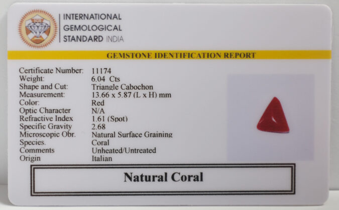 Beautiful 6.04 Cts Natural Coral (AAA+-Mines) sva 6+ Ratti CORAL. Free Horoscope & Free Pundit Ji Astrological Advise / Consultation. Original Natural Lab certified gems by IGI GTL / Birth stones / Large Gem Selection of shree shubh Rashi Ratan Vedic dhan at Gem Mines. May Bhagwan Brahma, Vishnu, Shiv & Universe bless you.