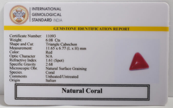 Beautiful 6.08 Cts Natural Coral (AAA+-Mines) sva 6+ Ratti CORAL. Free Horoscope & Free Pundit Ji Astrological Advise / Consultation. Original Natural Lab certified gems by IGI GTL / Birth stones / Large Gem Selection of shree shubh Rashi Ratan Vedic dhan at Gem Mines. May Bhagwan Brahma, Vishnu, Shiv & Universe bless you.
