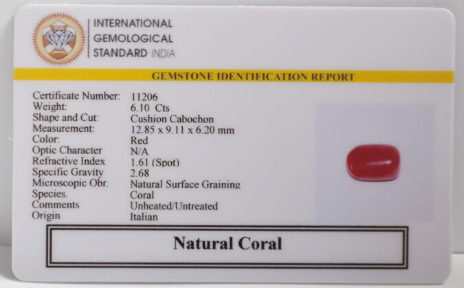 Beautiful 6.1 Cts Natural Coral (Top-Mines) sva 6+ Ratti CORAL. Free Horoscope & Free Pundit Ji Astrological Advise / Consultation. Original Natural Lab certified gems by IGI GTL / Birth stones / Large Gem Selection of shree shubh Rashi Ratan Vedic dhan at Gem Mines. May Bhagwan Brahma, Vishnu, Shiv & Universe bless you.