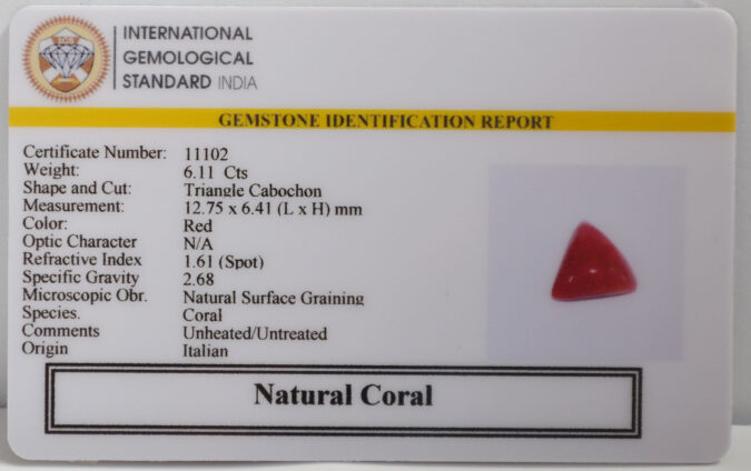 Beautiful 6.11 Cts Natural Coral (Top-Mines) sva 6+ Ratti CORAL. Free Horoscope & Free Pundit Ji Astrological Advise / Consultation. Original Natural Lab certified gems by IGI GTL / Birth stones / Large Gem Selection of shree shubh Rashi Ratan Vedic dhan at Gem Mines. May Bhagwan Brahma, Vishnu, Shiv & Universe bless you.