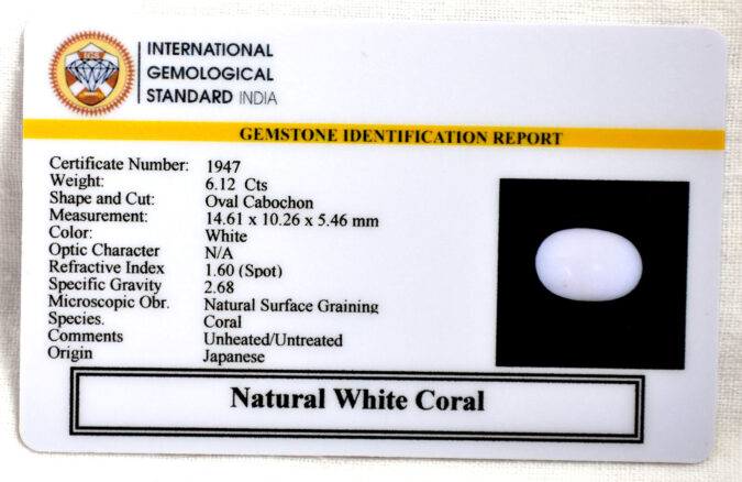 Beautiful 6.12 Cts Natural White Coral (Top-Mines) sva 6+ Ratti CORAL. Free Horoscope & Free Pundit Ji Astrological Advise / Consultation. Original Natural Lab certified gems by IGI GTL / Birth stones / Large Gem Selection of shree shubh Rashi Ratan Vedic dhan at Gem Mines. May Bhagwan Brahma, Vishnu, Shiv & Universe bless you.
