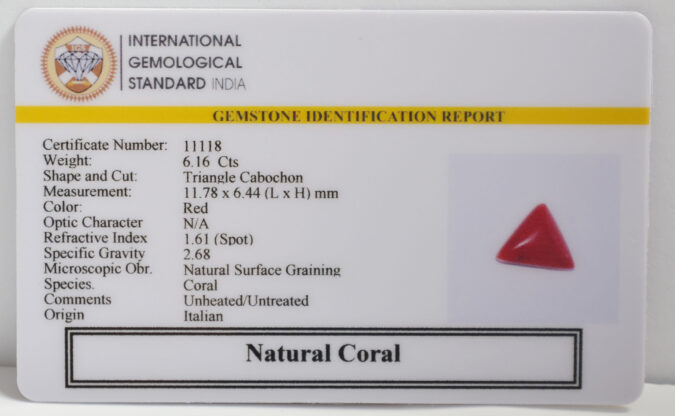 Beautiful 6.16 Cts Natural Coral (AAA+-Mines) sva 6+ Ratti CORAL. Free Horoscope & Free Pundit Ji Astrological Advise / Consultation. Original Natural Lab certified gems by IGI GTL / Birth stones / Large Gem Selection of shree shubh Rashi Ratan Vedic dhan at Gem Mines. May Bhagwan Brahma, Vishnu, Shiv & Universe bless you.