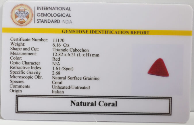 Beautiful 6.16 Cts Natural Coral (AAA+-Mines) sva 6+ Ratti CORAL. Free Horoscope & Free Pundit Ji Astrological Advise / Consultation. Original Natural Lab certified gems by IGI GTL / Birth stones / Large Gem Selection of shree shubh Rashi Ratan Vedic dhan at Gem Mines. May Bhagwan Brahma, Vishnu, Shiv & Universe bless you.