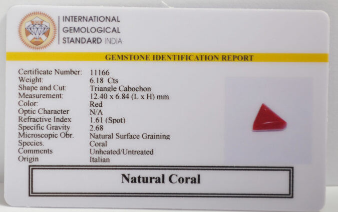 Beautiful 6.18 Cts Natural Coral (Top-Mines) sva 6+ Ratti CORAL. Free Horoscope & Free Pundit Ji Astrological Advise / Consultation. Original Natural Lab certified gems by IGI GTL / Birth stones / Large Gem Selection of shree shubh Rashi Ratan Vedic dhan at Gem Mines. May Bhagwan Brahma, Vishnu, Shiv & Universe bless you.