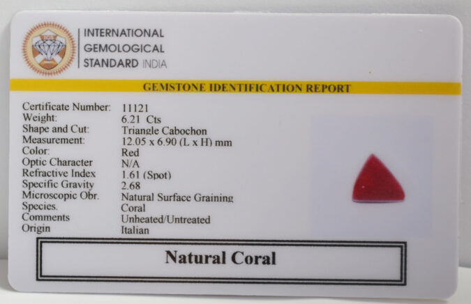 Beautiful 6.21 Cts Natural Coral (AAA+-Mines) sva 6+ Ratti CORAL. Free Horoscope & Free Pundit Ji Astrological Advise / Consultation. Original Natural Lab certified gems by IGI GTL / Birth stones / Large Gem Selection of shree shubh Rashi Ratan Vedic dhan at Gem Mines. May Bhagwan Brahma, Vishnu, Shiv & Universe bless you.