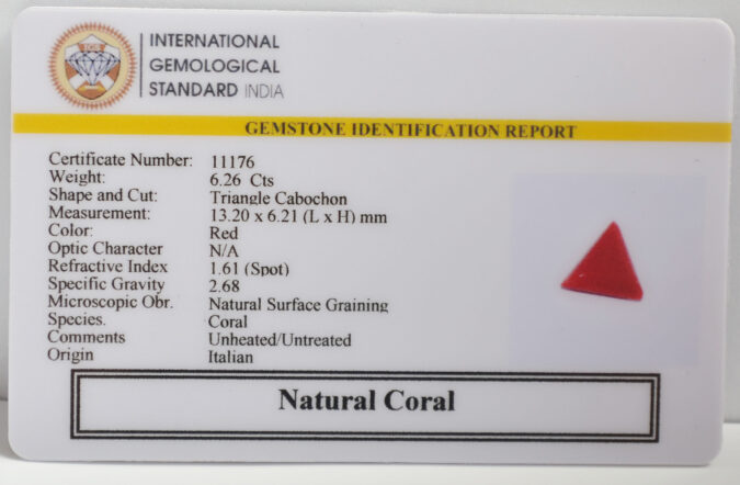 Beautiful 6.26 Cts Natural Coral (AAA+-Mines) sva 6+ Ratti CORAL. Free Horoscope & Free Pundit Ji Astrological Advise / Consultation. Original Natural Lab certified gems by IGI GTL / Birth stones / Large Gem Selection of shree shubh Rashi Ratan Vedic dhan at Gem Mines. May Bhagwan Brahma, Vishnu, Shiv & Universe bless you.
