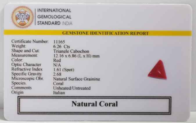 Beautiful 6.26 Cts Natural Coral (AAA+-Mines) sva 6+ Ratti CORAL. Free Horoscope & Free Pundit Ji Astrological Advise / Consultation. Original Natural Lab certified gems by IGI GTL / Birth stones / Large Gem Selection of shree shubh Rashi Ratan Vedic dhan at Gem Mines. May Bhagwan Brahma, Vishnu, Shiv & Universe bless you.